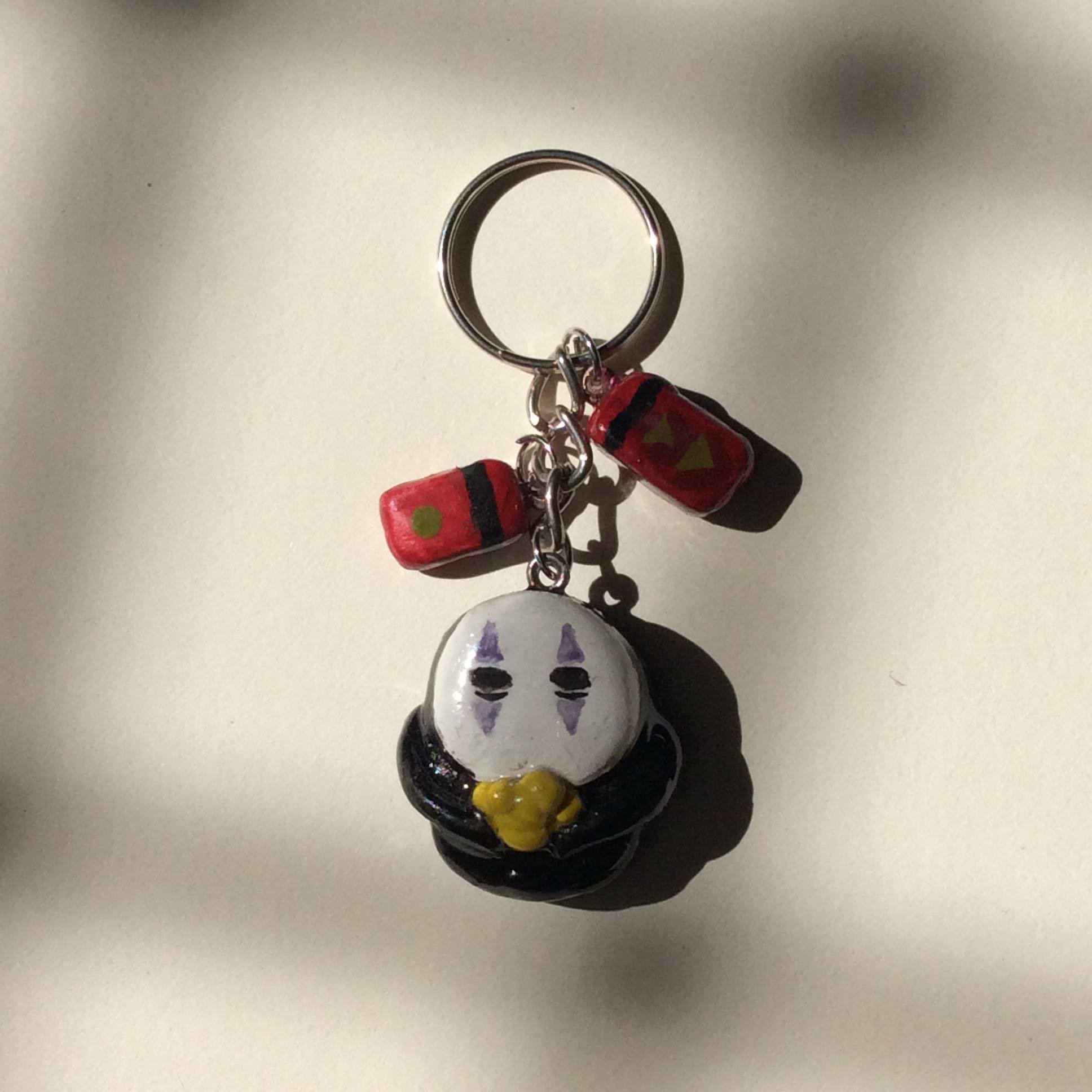 Crafted from durable dry clay, this No-Face keychain embodies the mysterious spirit from Spirited Away. A must-have collectible for Studio Ghibli fans who love its eerie charm and quiet magic.